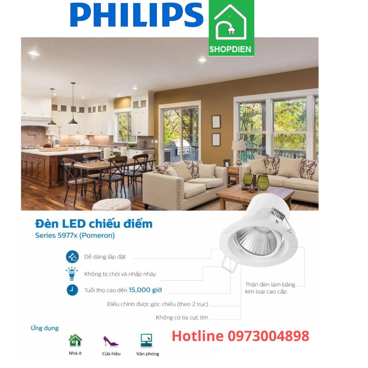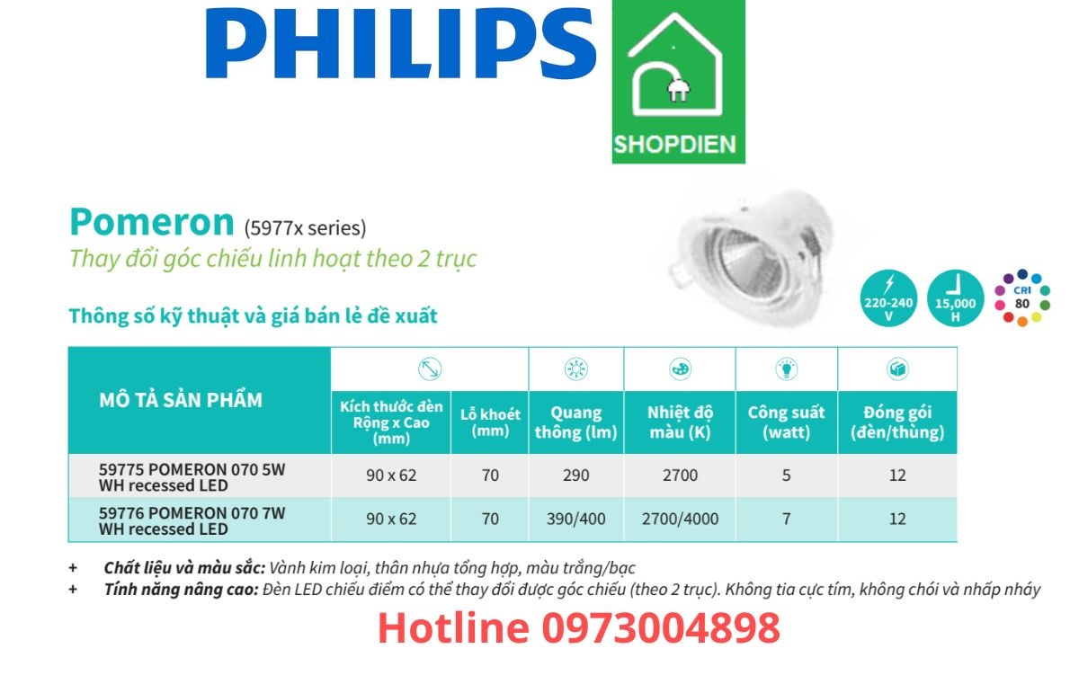 Quý khách hàng có nhu cầu tư vấn sử dụng Đèn rọi âm trần PHILIPS 7W D70 59776 POMERON vui lòng liên hệ với www.shopdien.vn hoặc hotline 0973004898.
