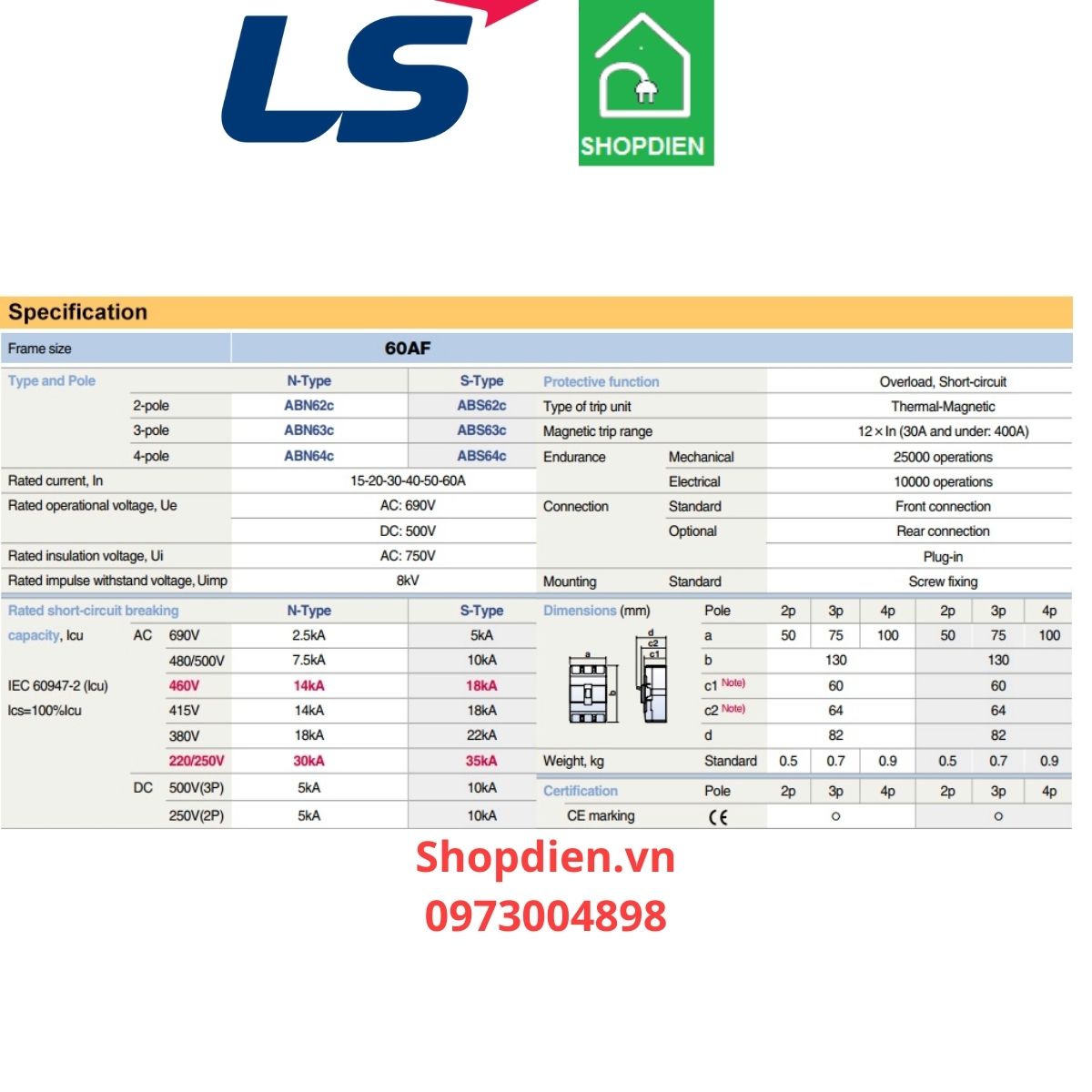 TÊN SẢN PHẨM: ABN62C LS MCCB 2P 60A 30kA Aptomat Cầu dao tự động