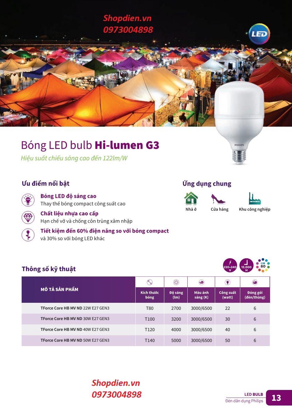 Tên sản phẩm : Bóng đèn LEDBulb trụ Hi-lumen 50W đui xoáy E27 TForce Core HB MV ND Philips