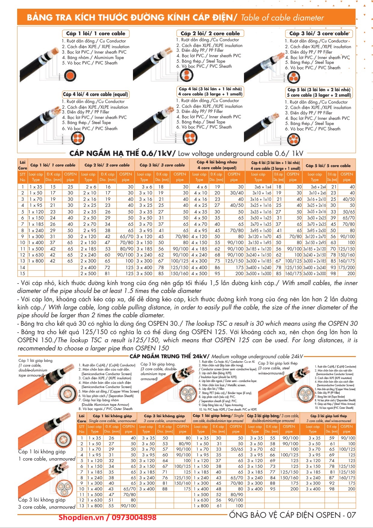 Bảng tra kích thước đường kính ngoài cáp điện tương ứng kích thước ống cần chọn :