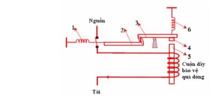 Trường hợp mạch quá tải hoặc mạch bị ngắt, nam châm điện số 5 sẽ hút phần ứng số 4. Đồng thời làm bật nhả móc số 3 kéo theo móc số 5 sẽ được thả tự do và lò xo số 4 dần rơi vào trạng thái thả lỏng. Và kết quả cuối cùng là hệ thống tiếp điểm của MCCB dần mở ra và làm cho mạch điện bị ngắt theo.