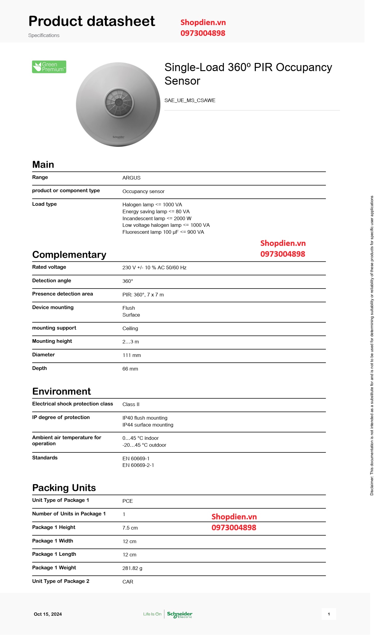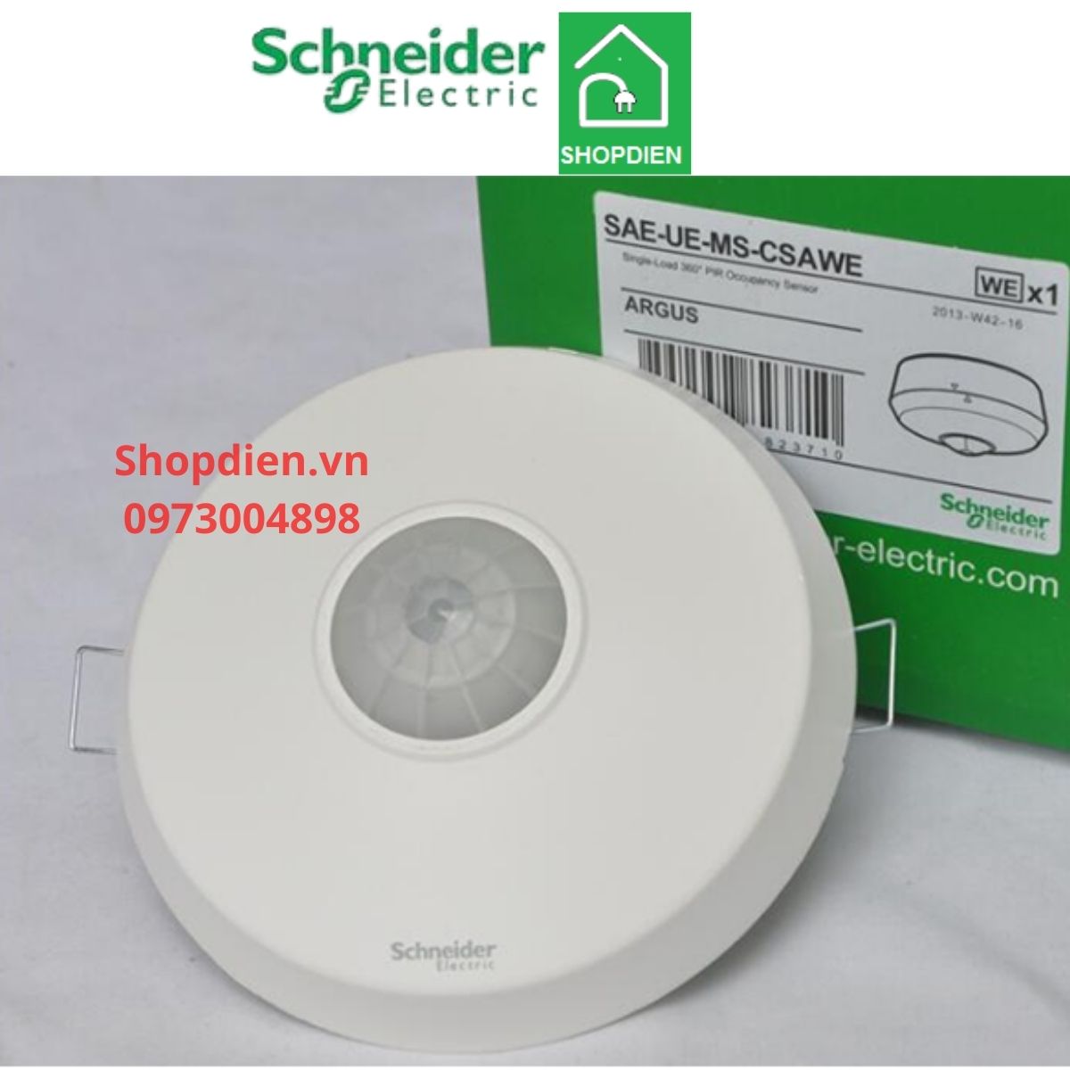SAE_UE_MS_CSAWE Schneider Cảm biến chuyển động hồng ngoại 1 kênh 2000W 360 độ của Schneider Electric là một thiết bị dùng để phát hiện chuyển động trong không gian thông qua công nghệ hồng ngoại thụ động (PIR - Passive Infrared). Khi cảm biến phát hiện có sự di chuyển của con người hoặc vật thể trong phạm vi quét, nó sẽ kích hoạt để bật hoặc tắt các thiết bị điện (như đèn chiếu sáng, hệ thống an ninh, quạt, v.v.) tùy thuộc vào cài đặt của người dùng. Dưới đây là các đặc điểm chính của thiết bị này: