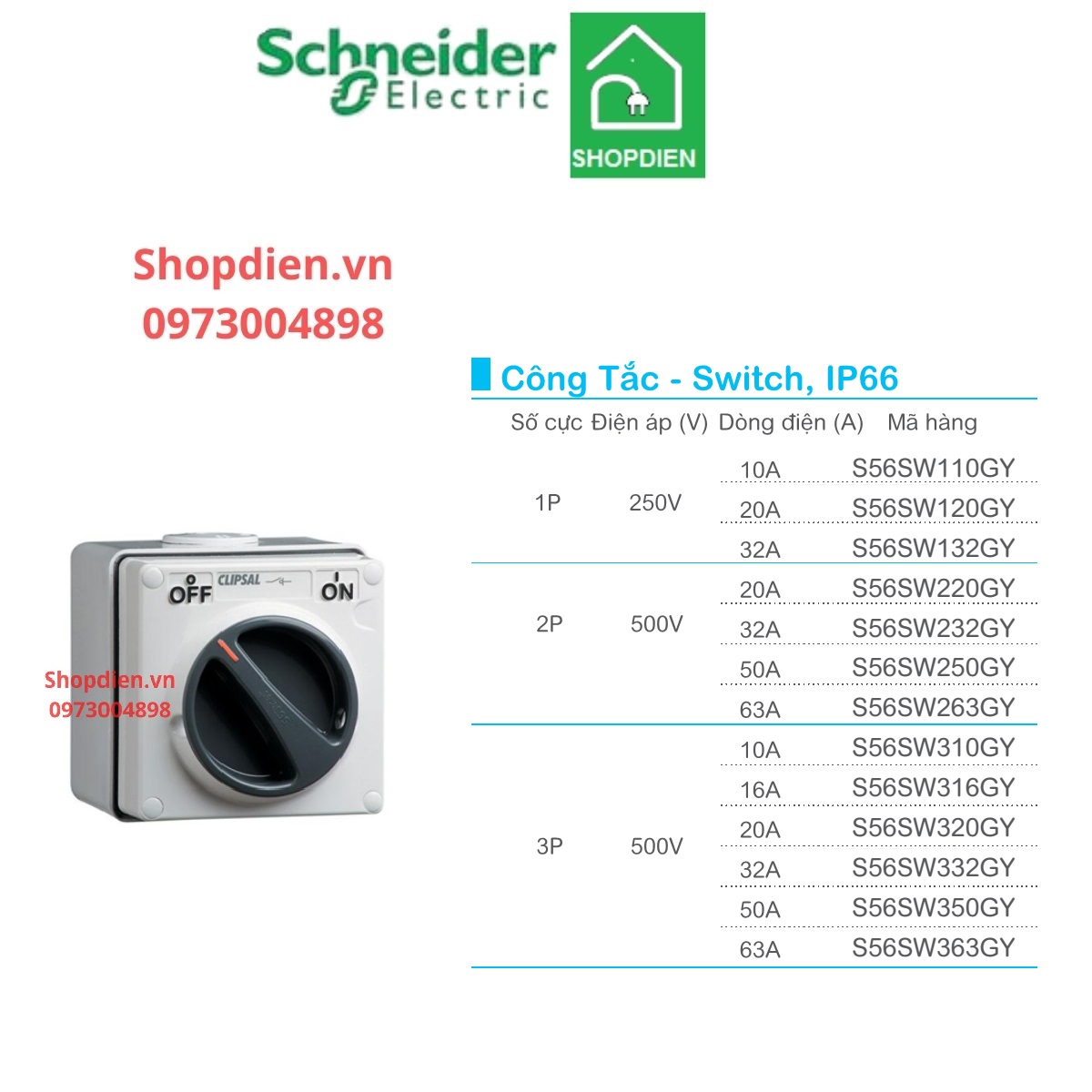 Tên sản phẩm: Công tắc 2P 20A Schneider S56SW220GY switch IP66 S56