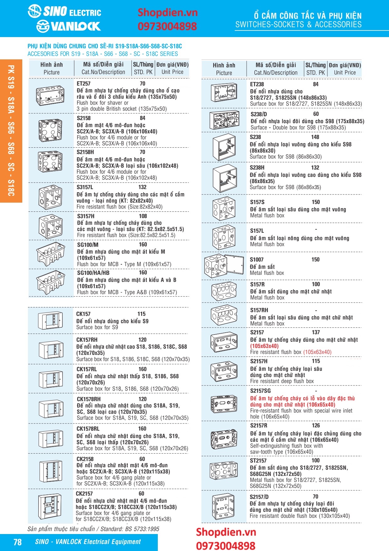 Tên sản phẩm : S238 SINO Đế nổi vuông loại thấp chuẩn Anh BS Standard