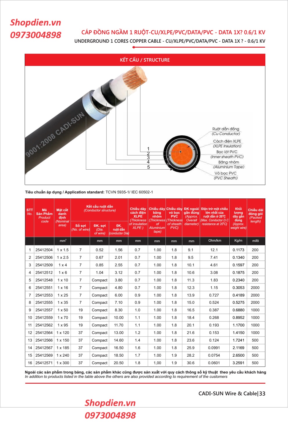 - Quy cách cách điện: Cu/XLPE/PVC/DATA/PVC