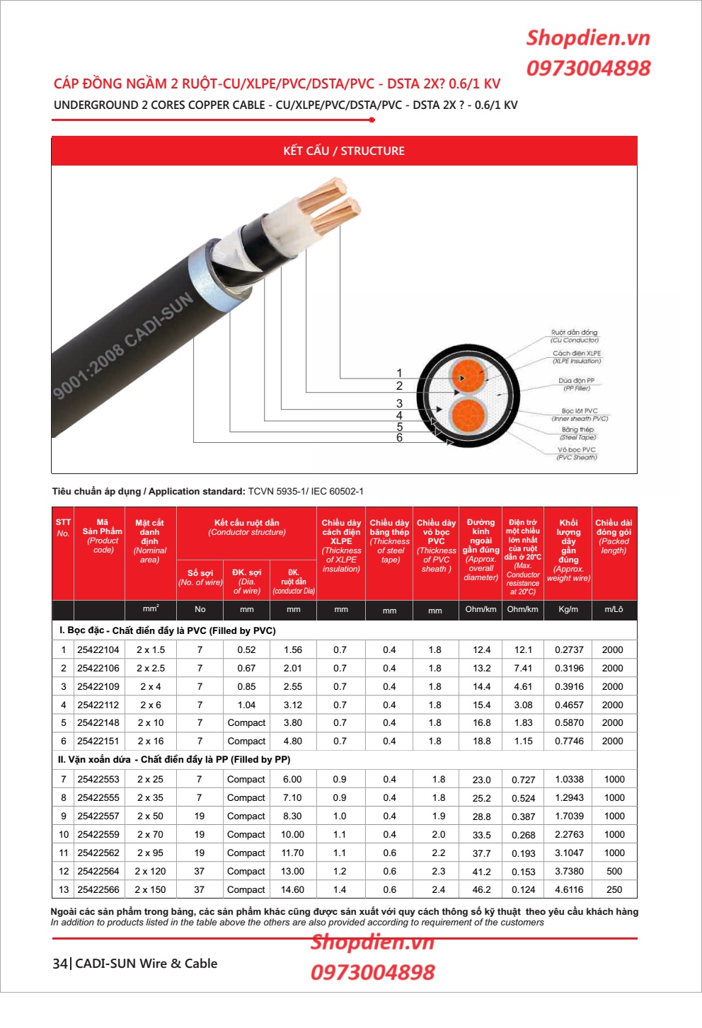 Mã sàn phẩm : Cáp ngầm 2 ruột Cu / XLPE/DSTA/PVC CADISUN CXV-DSTA 2X