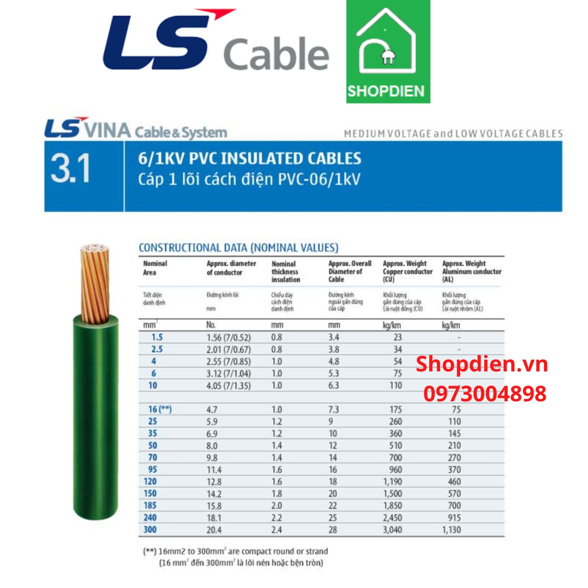 Tên sản phẩm: CV 1x1.5 mm2 LS vina Dây đơn Cu/PVC 0.6/1KV