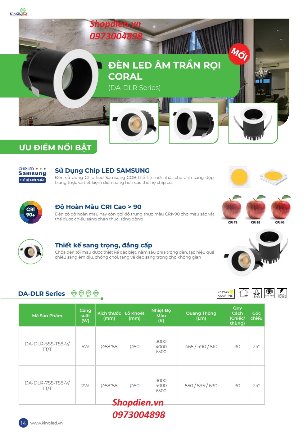 Catalogue : DA-DLR-5SS-T48 KINGLED Đèn rọi âm trần 5W D50 CORAL