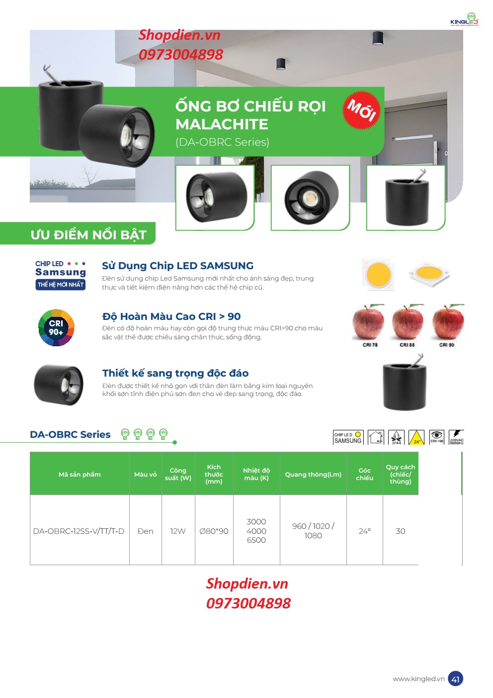 Catalogue: DA-OBRC-12SS-D KINGLED Đèn ống bơ 12W MALACHITE chiếu rọi vỏ đen