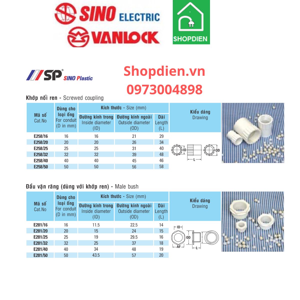 Quý khách hàng có nhu cầu tư vấn sử dụng Đầu nối ren nối ống D50 SINO SP E258 +281/50 Rắc co PIPE Connector của Sino SP vui lòng liên hệ với www.shopdien.vn hoặc hotline 0973004898.