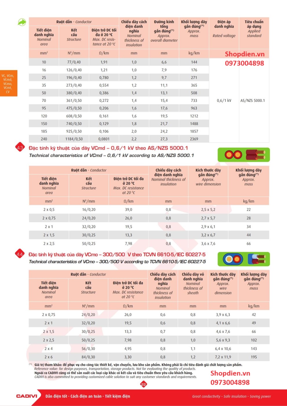 Tên sản phẩm: Dây đôi dẹt ovan Cu/PVC/PVC 2x6mm2 Vcmo Cadivi