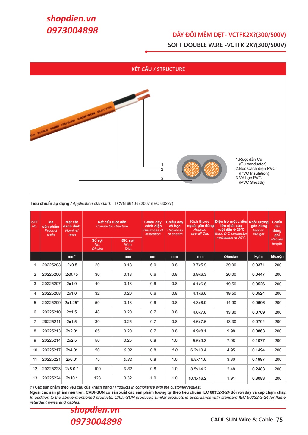Catalogue Dây đôi OVAN Cu/PVC/PVC 2x4mm2 VCTFK Cadisun