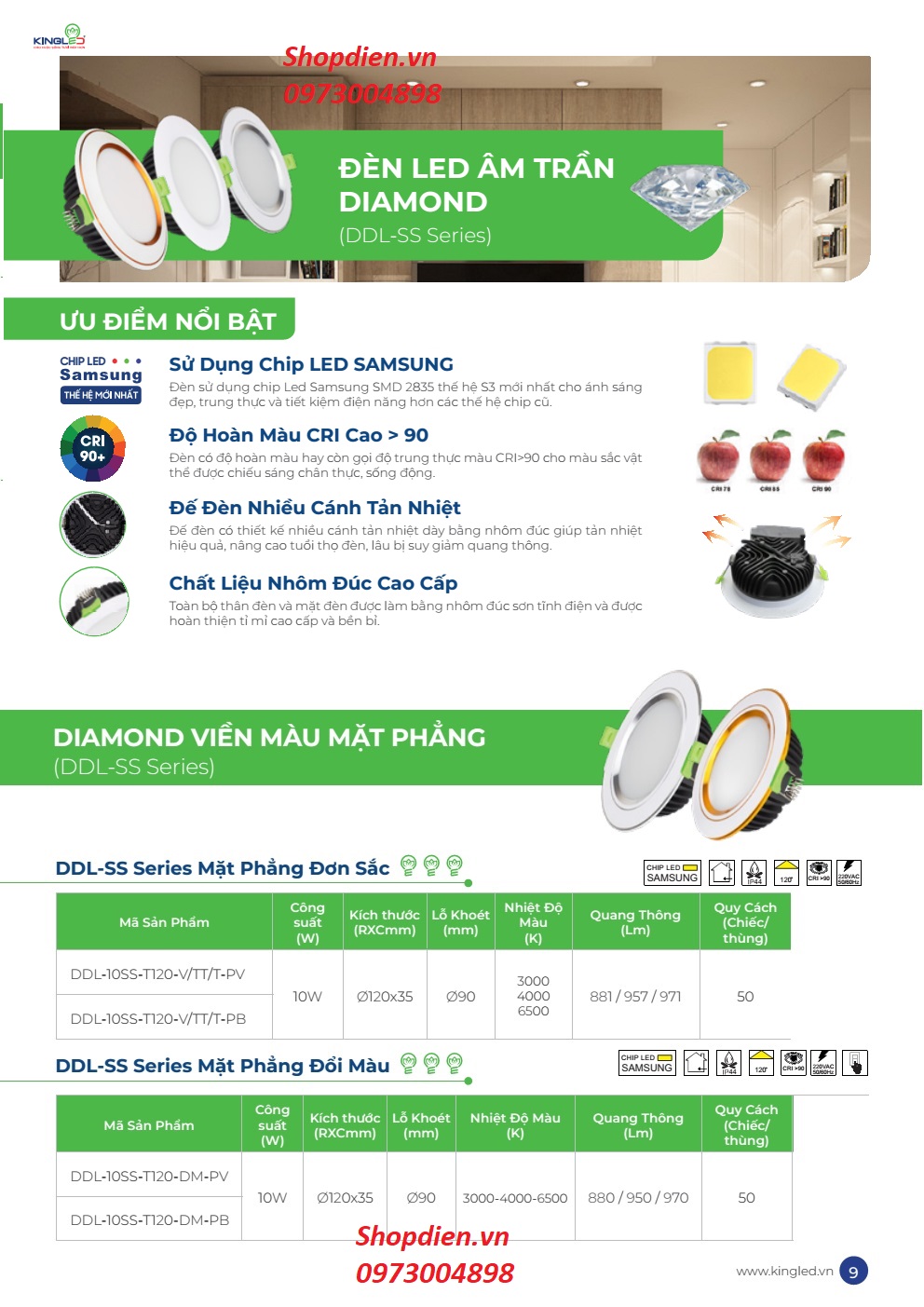 Catalogue : DDL-10SS-T120-DM-PB KINGLED Đèn Downlight đổi màu 10W D90 DIAMOND viền vàng âm trần