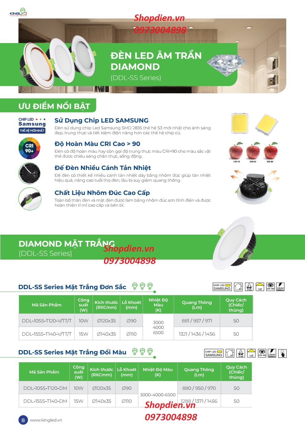Catalogue : DDL-15SS-T140-DM KINGLED Đèn downlight 15W D110 DIAMOND đổi màu âm trần