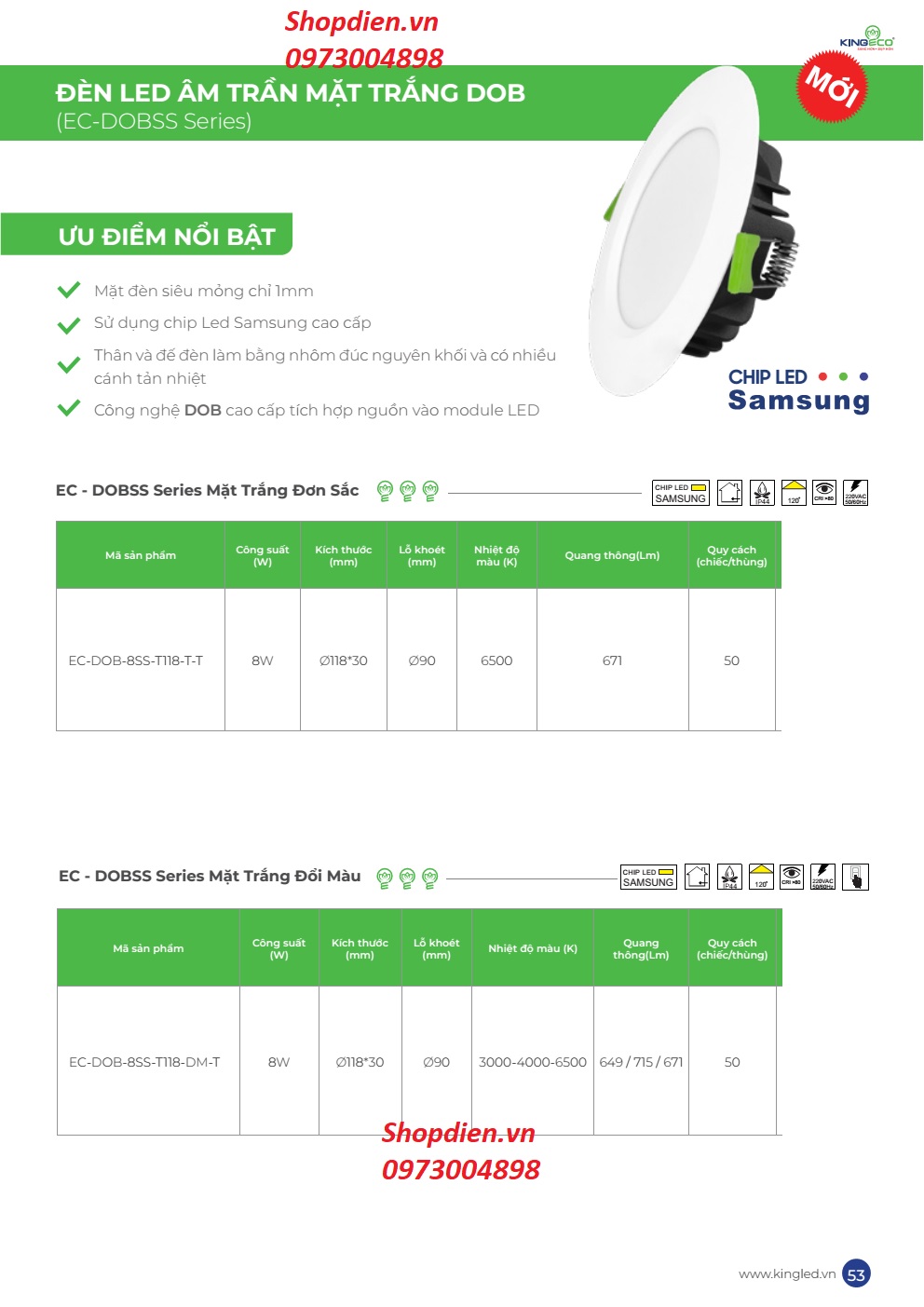 TÊN SẢN PHẨM : Đèn downlight âm trần 8W D90 đổi màu DOB KINGLED EC-DOB-8SS-T118-DM-T