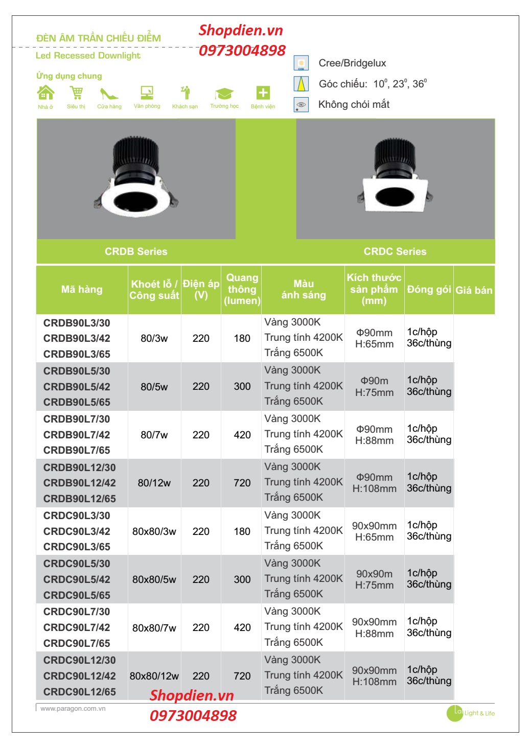 TÊN SẢN PHẨM : Đèn downlight rọi chiếu điểm âm trần 12W D80 CRDB Paragon CRDB90L12