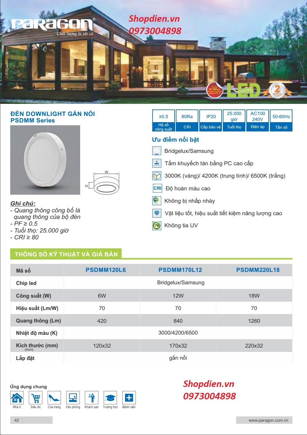TÊN SẢN PHẨM : Đèn ốp nổi trần tròn 6W D120 PSDMM Paragon PSDMM120L6