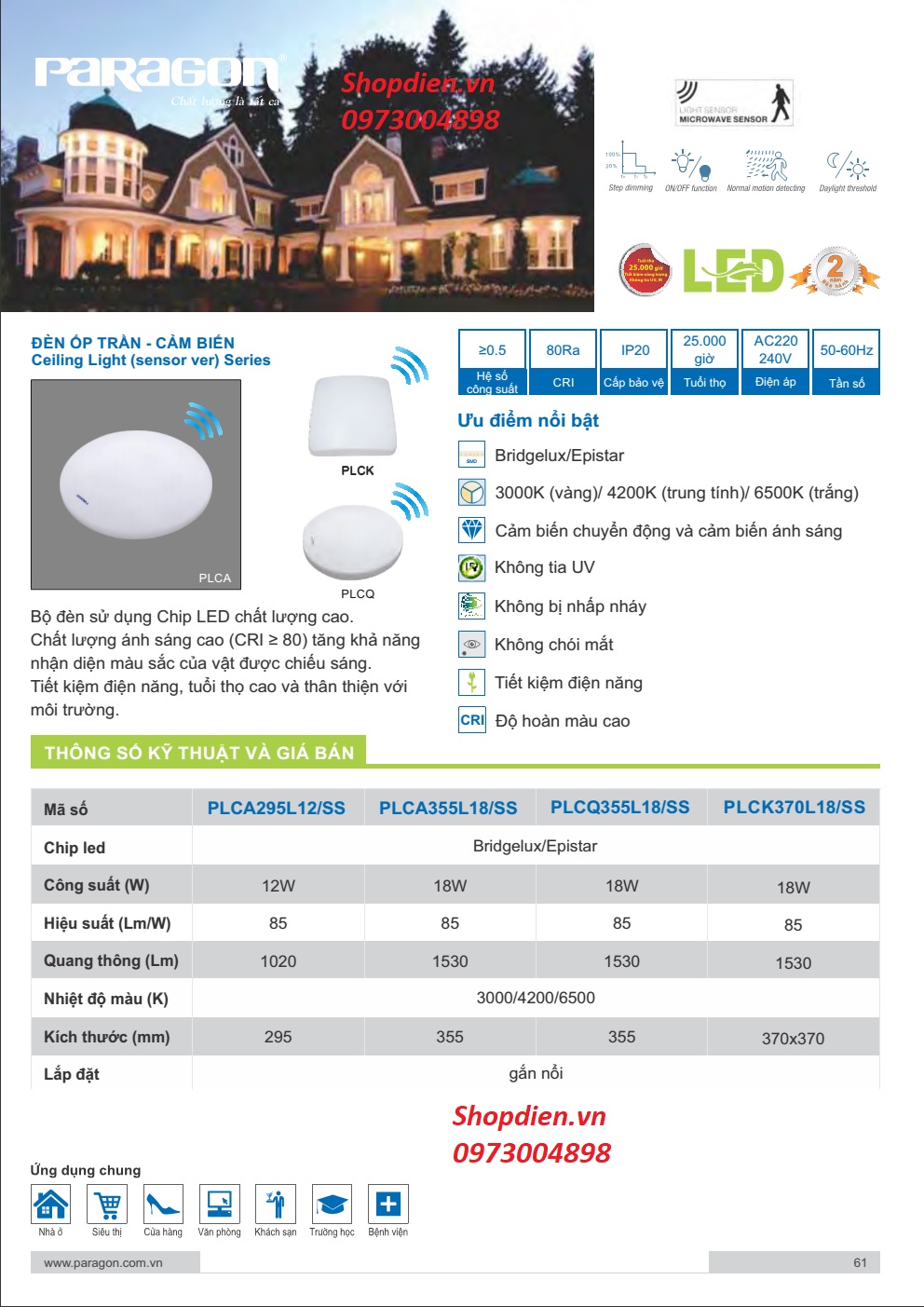 TÊN SẢN PHẨM : Đèn ốp nổi trần tròn cảm biến 18W D355mm Paragon PLCQ355L18/SS