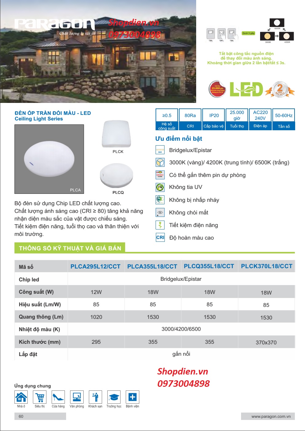 TÊN SẢN PHẨM : Đèn ốp nổi trần tròn đổi màu 18W D370 Paragon PLCA355L18/CCT