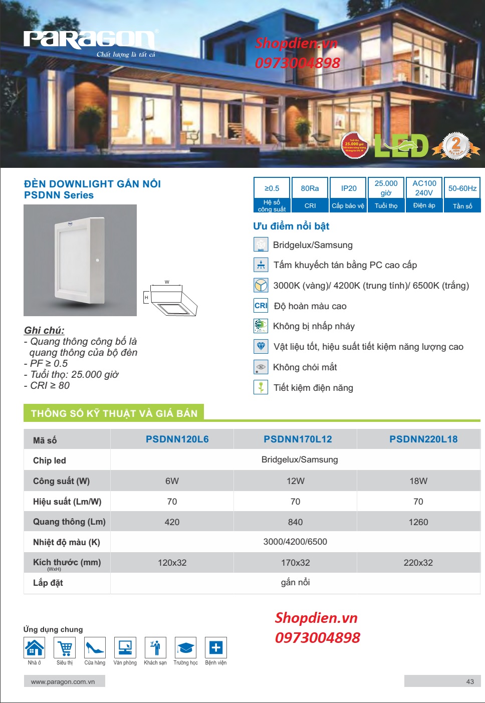 TÊN SẢN PHẨM : Đèn ốp nổi trần vuông 12W D170 PSDNN Paragon PSDNN170L12