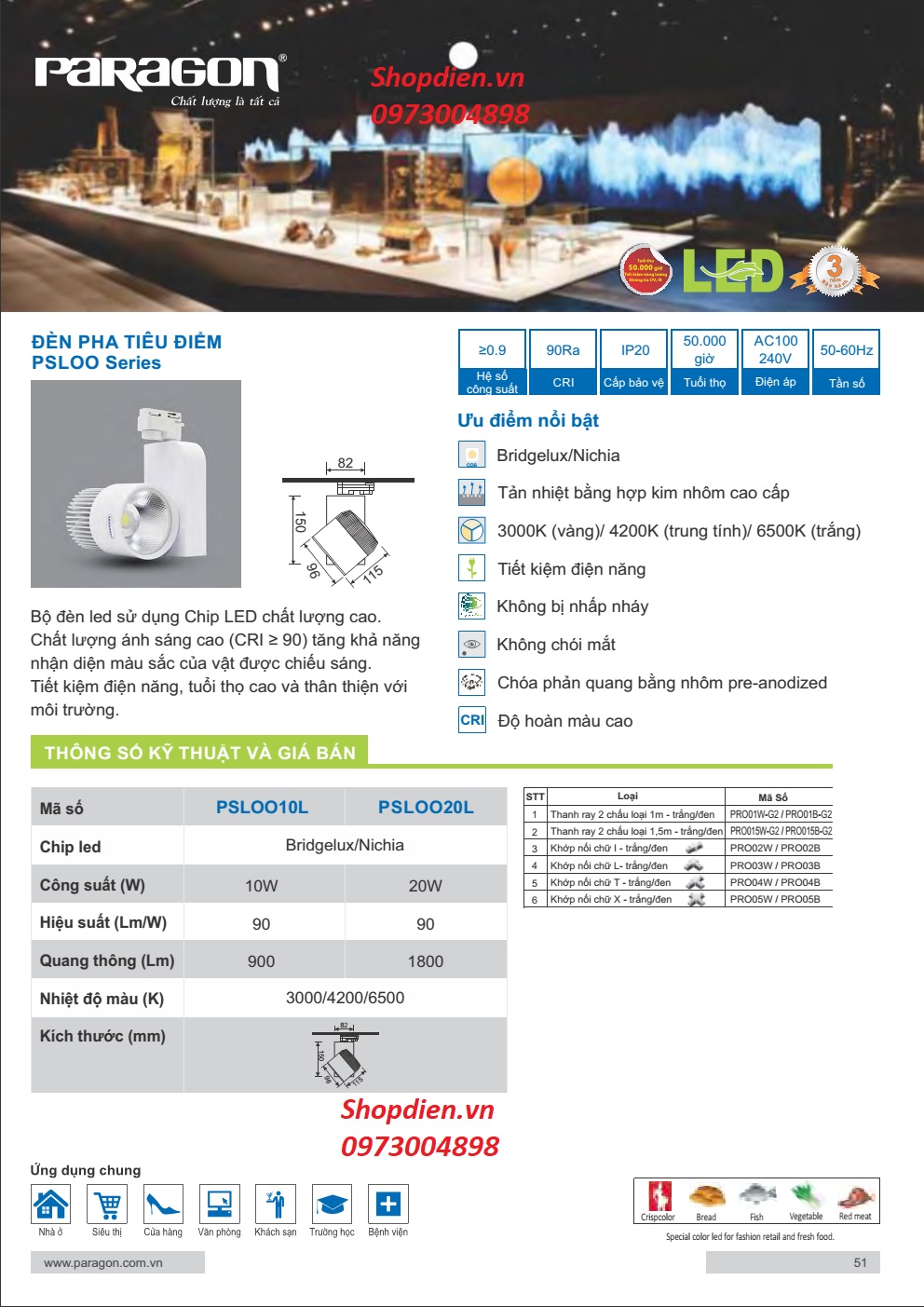 TÊN SẢN PHẨM : Đèn ray rọi tiêu điểm LED Track Light 10W Paragon PSLOO10L