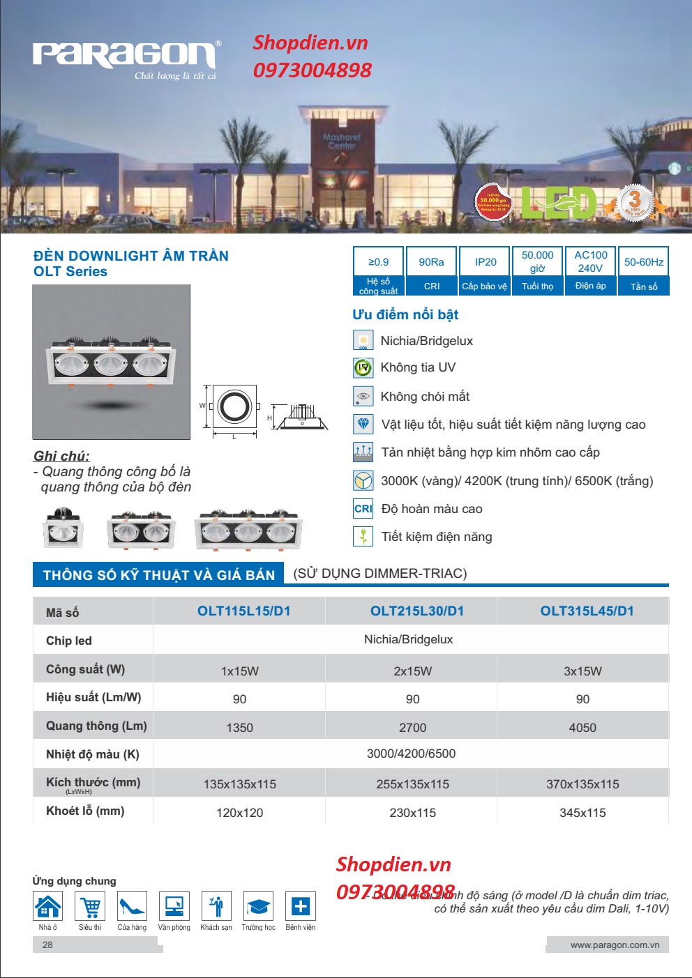 TÊN SẢN PHẨM : Đèn rọi âm trần ba điều chỉnh góc Dimmer 45W Paragon OLT315L45/D 345x115