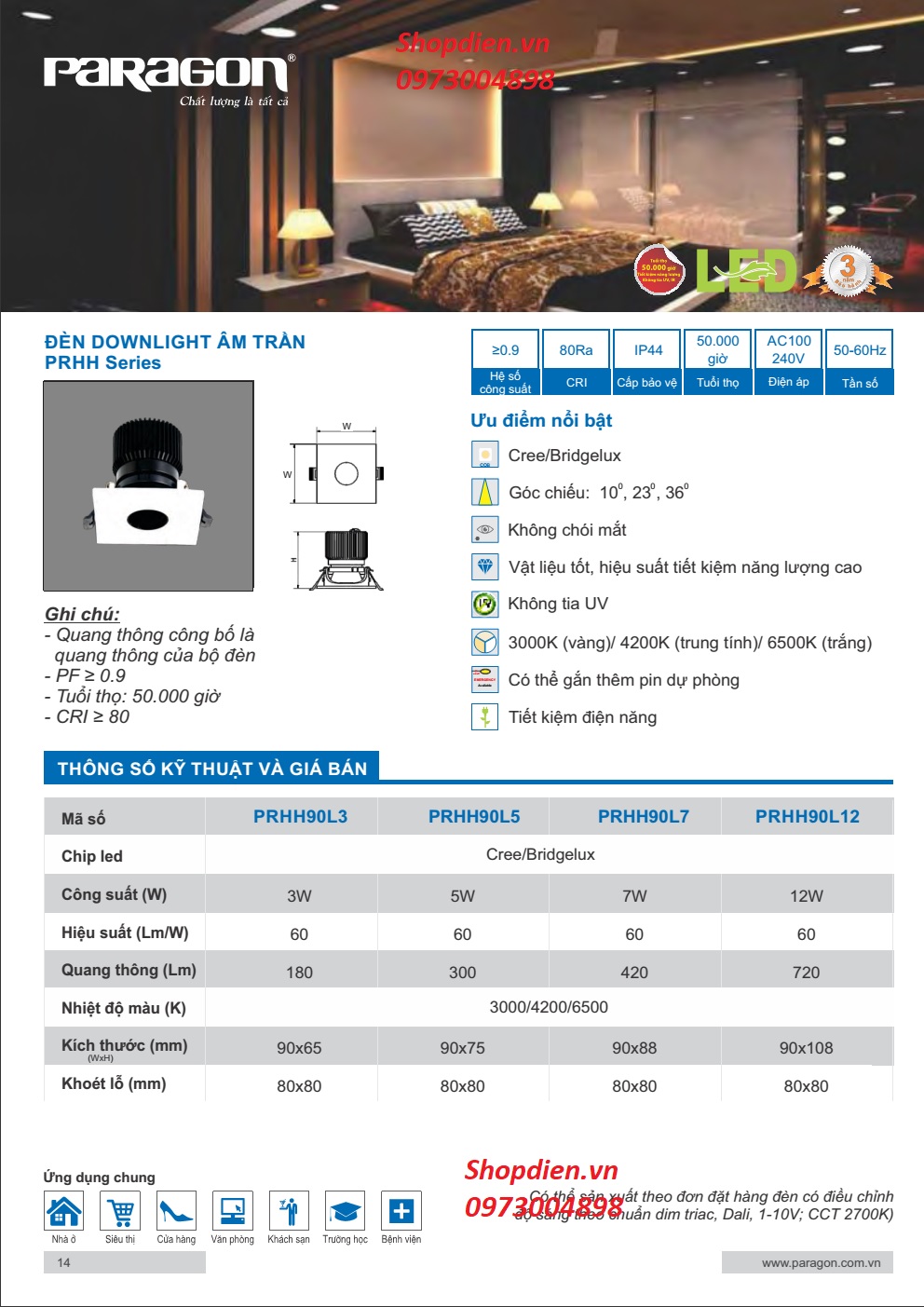 TÊN SẢN PHẨM : Đèn rọi vuông âm trần điều chỉnh góc 12W D80 Paragon PRHH90L12