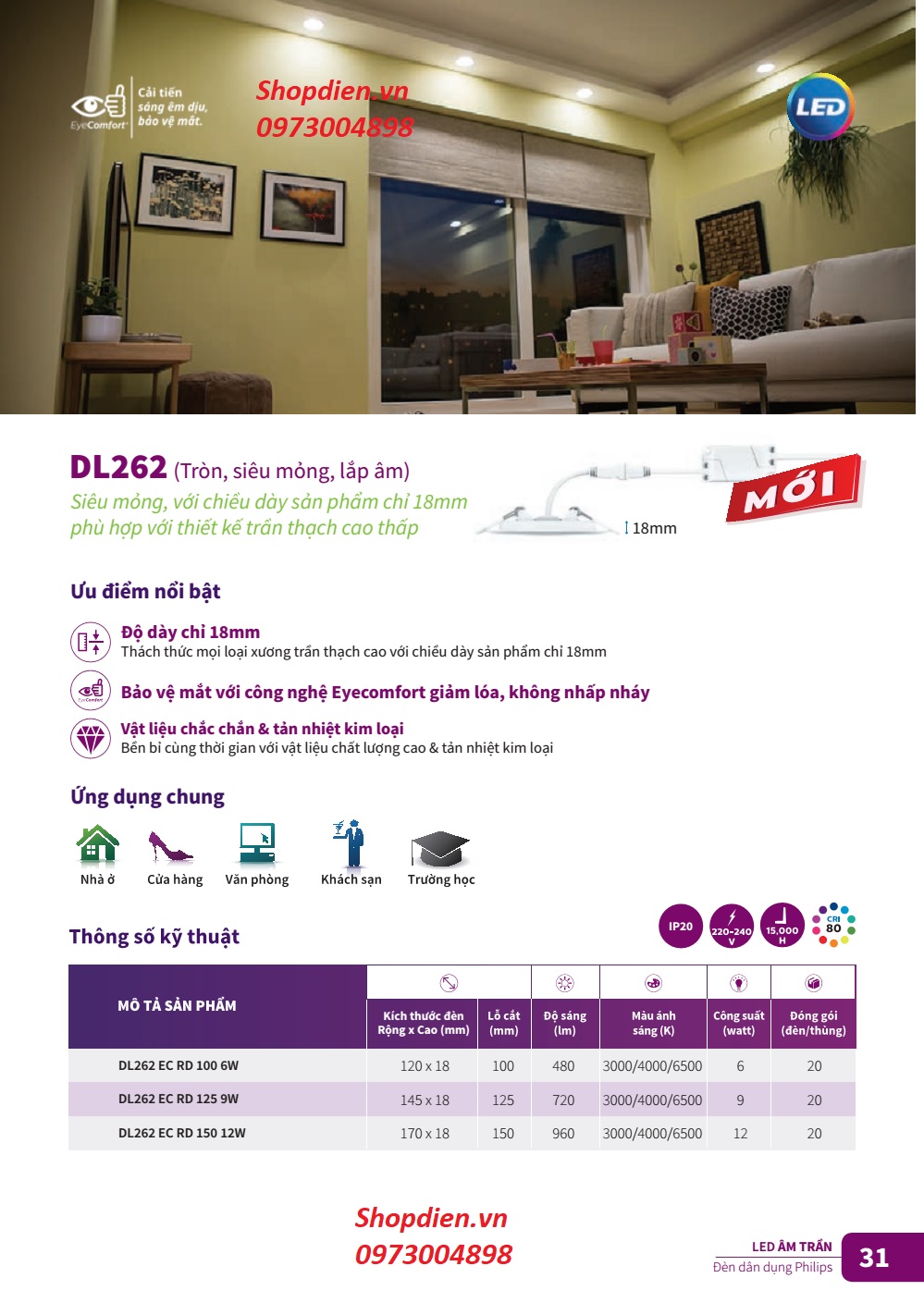Quý khách hàng có nhu cầu tư vấn sử dụng Đèn downlight siêu mỏng âm trần 12W D100 Philips DL262 vui lòng liên hệ với www.shopdien.vn hoặc hotline 0973004898.