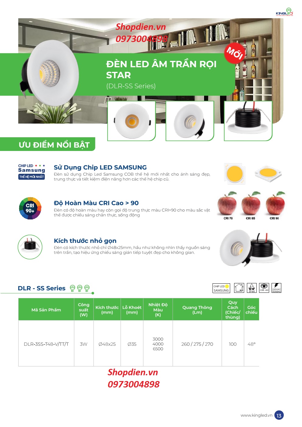 Catalogue : DLR-3SS-T48 KINGLED Đèn rọi âm trần 3W D35 chiếu rọi chỉnh góc