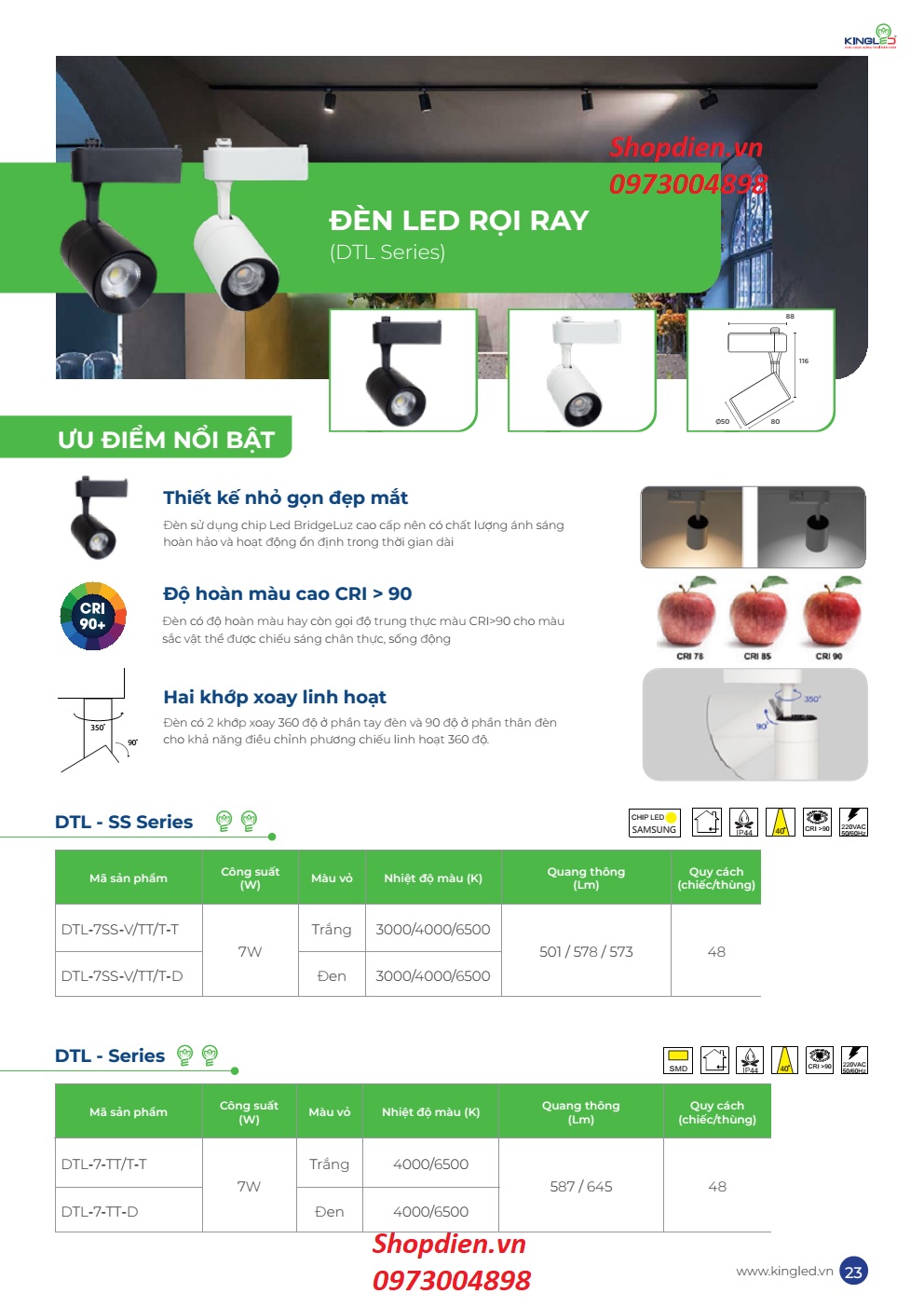 Catalogue : DTL-7SS KINGLED Đèn LED rọi ray 7W DTL vỏ trắng, đen