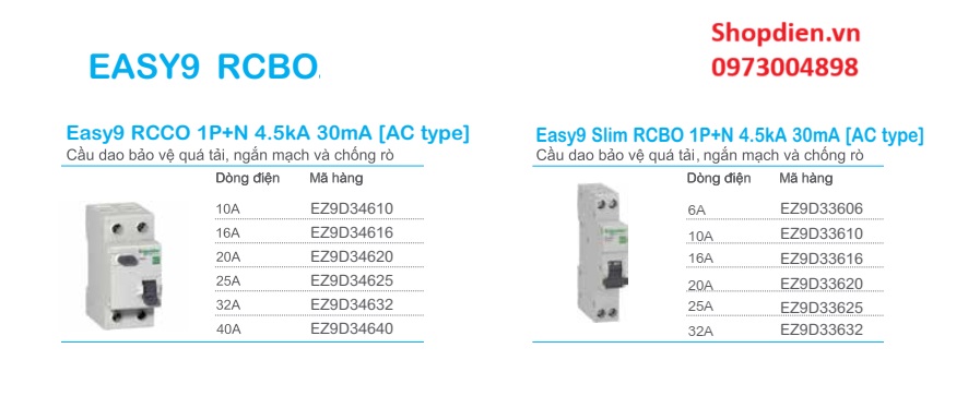 Catalogue Aptomat chống giật rò điện RCBO 2P 25A 30mA EZ9D34625 Easy9