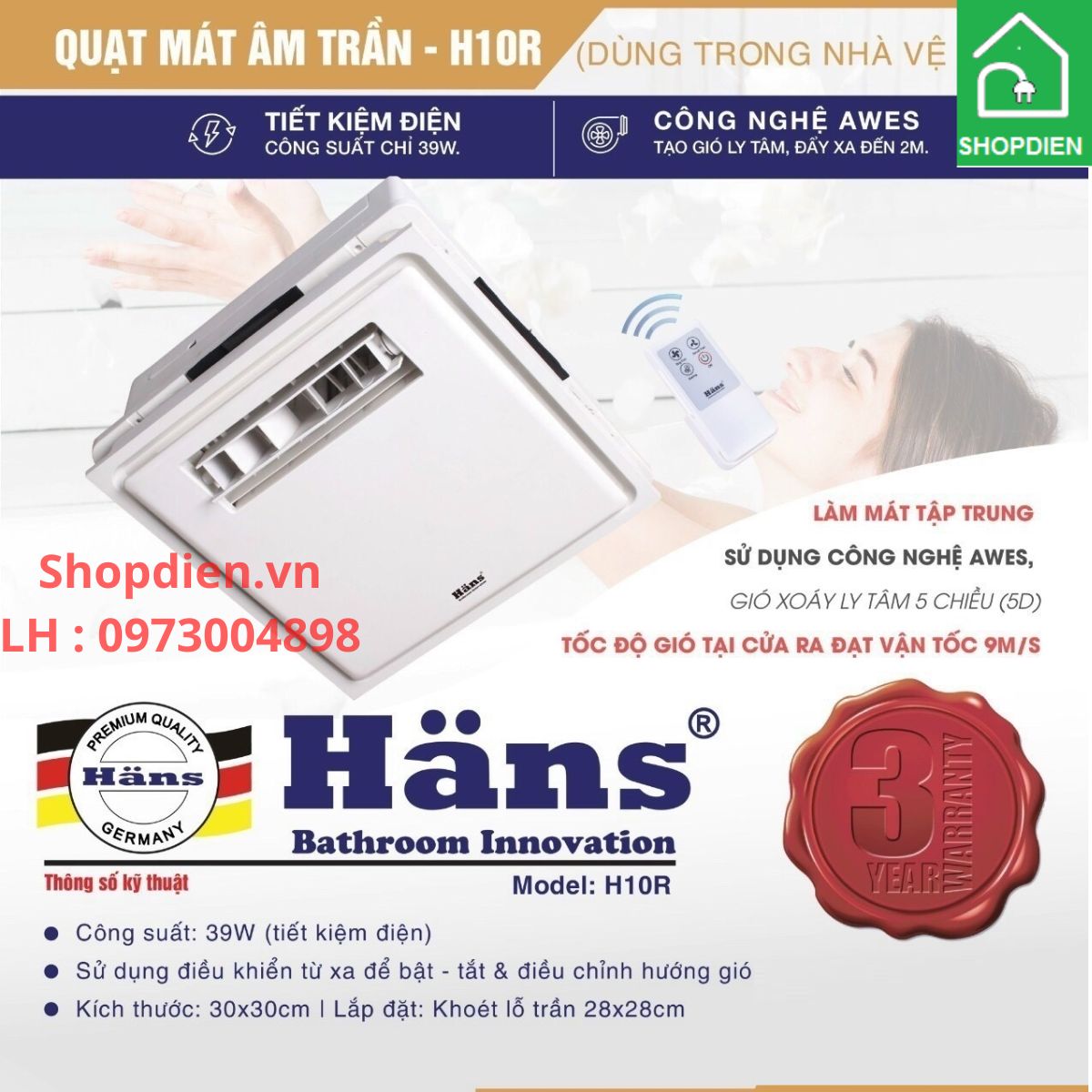 HANS H10R Quạt thổi mát âm trần điều khiển từ xa – Thông số kỹ thuật và ứng dụng