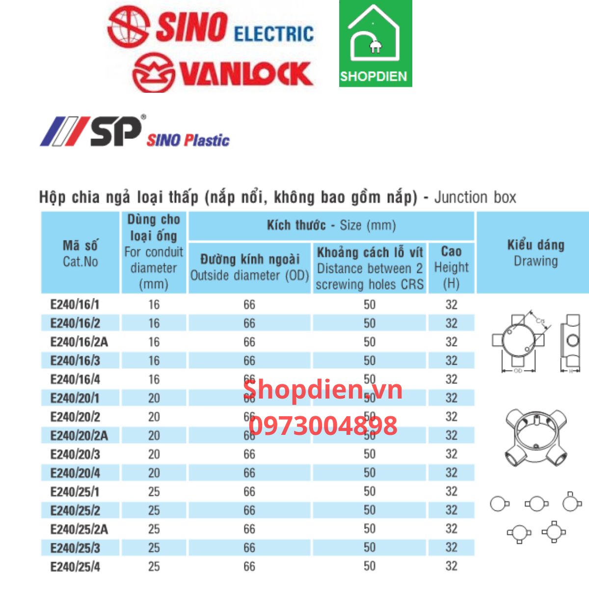 Catalogue Hôp chia ngả D25 SINO SP E240/25 Junction Box chia 1, chia 2, chia 3, chia 4