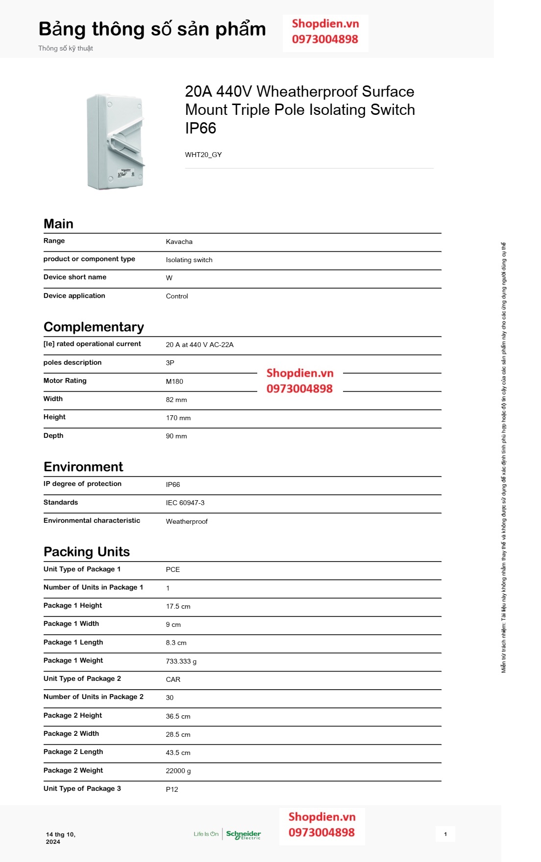 Catalogue ISOLATOR Cầu dao 3P 20A SCHNEIDER WHT20_GY_G19 ngắt điện chống thấm nước IP66