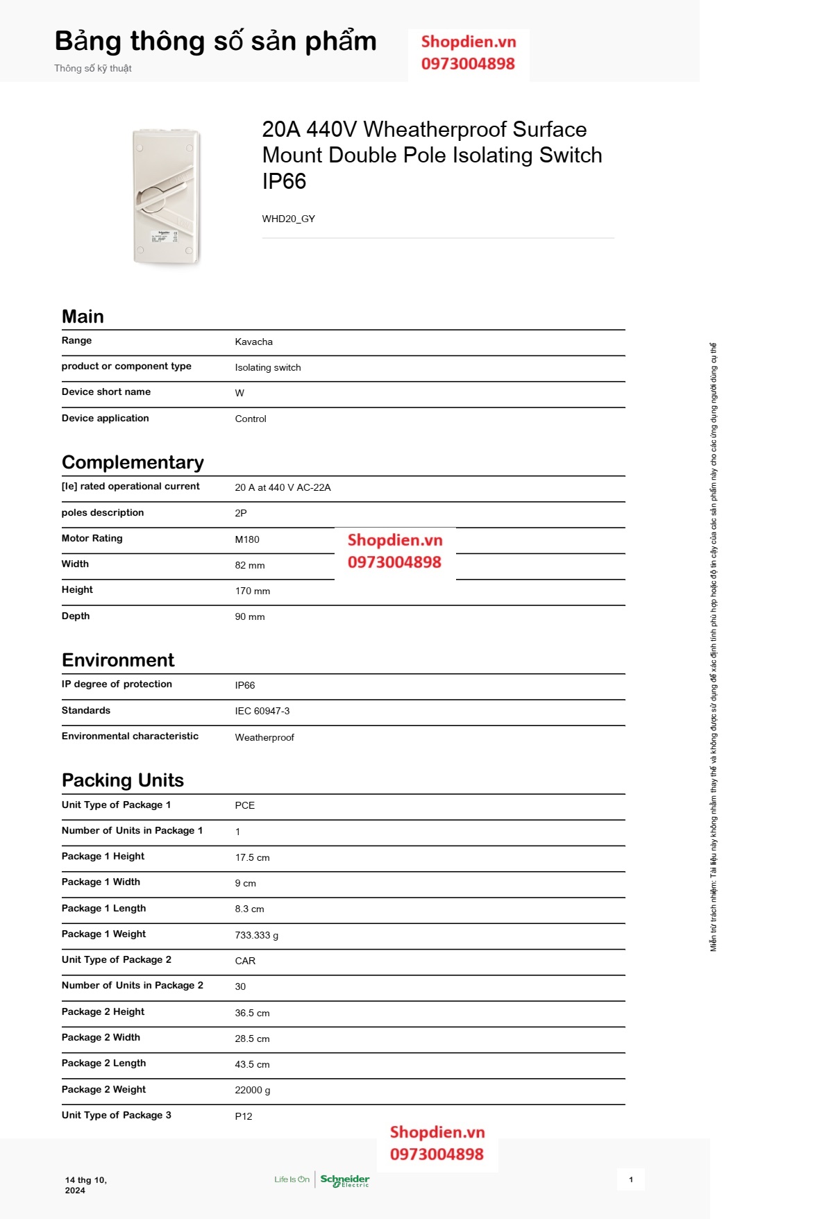 Catalogue WHD20_GY_G19 SCHNEIDER ISOLATOR 2P 20A Cầu dao ngắt điện chống thấm nước IP66