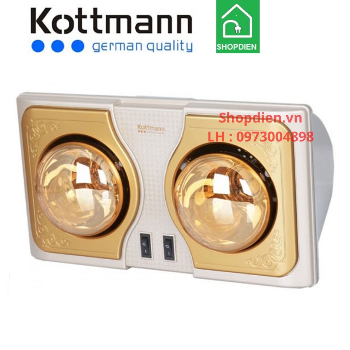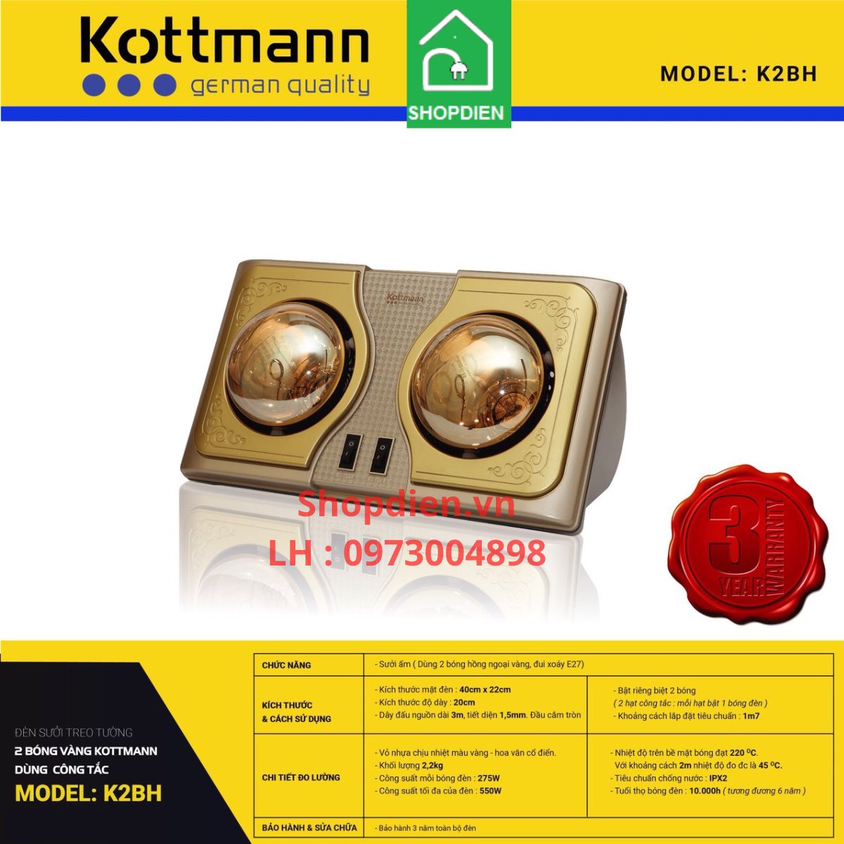 K2BH Kottmann Đèn sưởi 2 bóng treo tường công tắc – Thông số kỹ thuật và ứng dụng