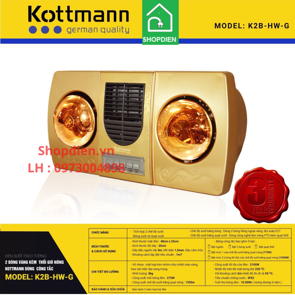 K2B-HW-G KOTTMANN Đèn sưởi 2 bóng treo tường kèm thổi nóng công tắc – Thông số kỹ thuật và ứng dụng