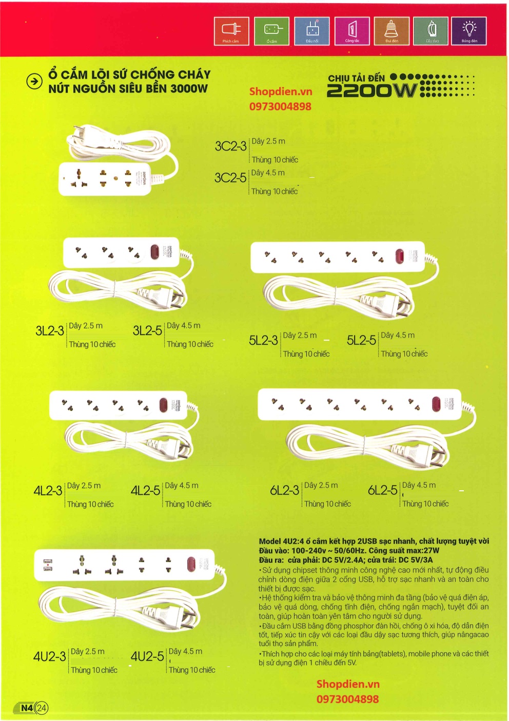 Số lượng ổ cắm : bốn ổ cắm điện
