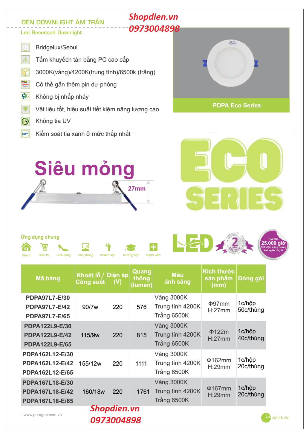 TÊN SẢN PHẨM : PDPA97L7-E Paragon Đèn downlight siêu mỏng 7W D90 PDPA-ECO âm trần
