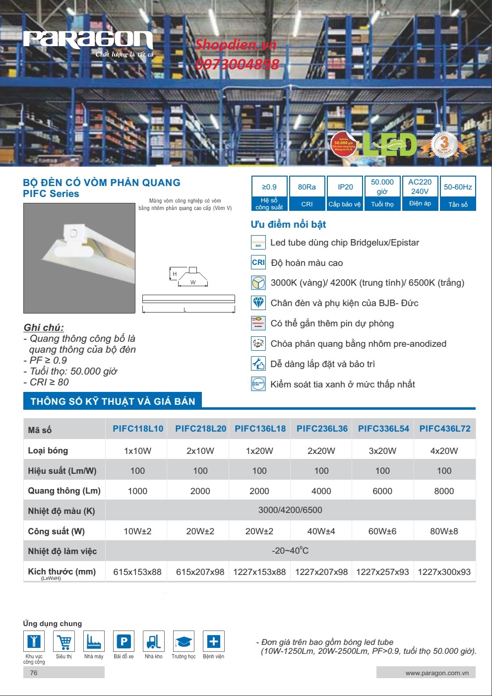 TÊN SẢN PHẨM : PIFC336L54 Paragon Bộ đèn chóa phản quang ba 1.2M 3x20W