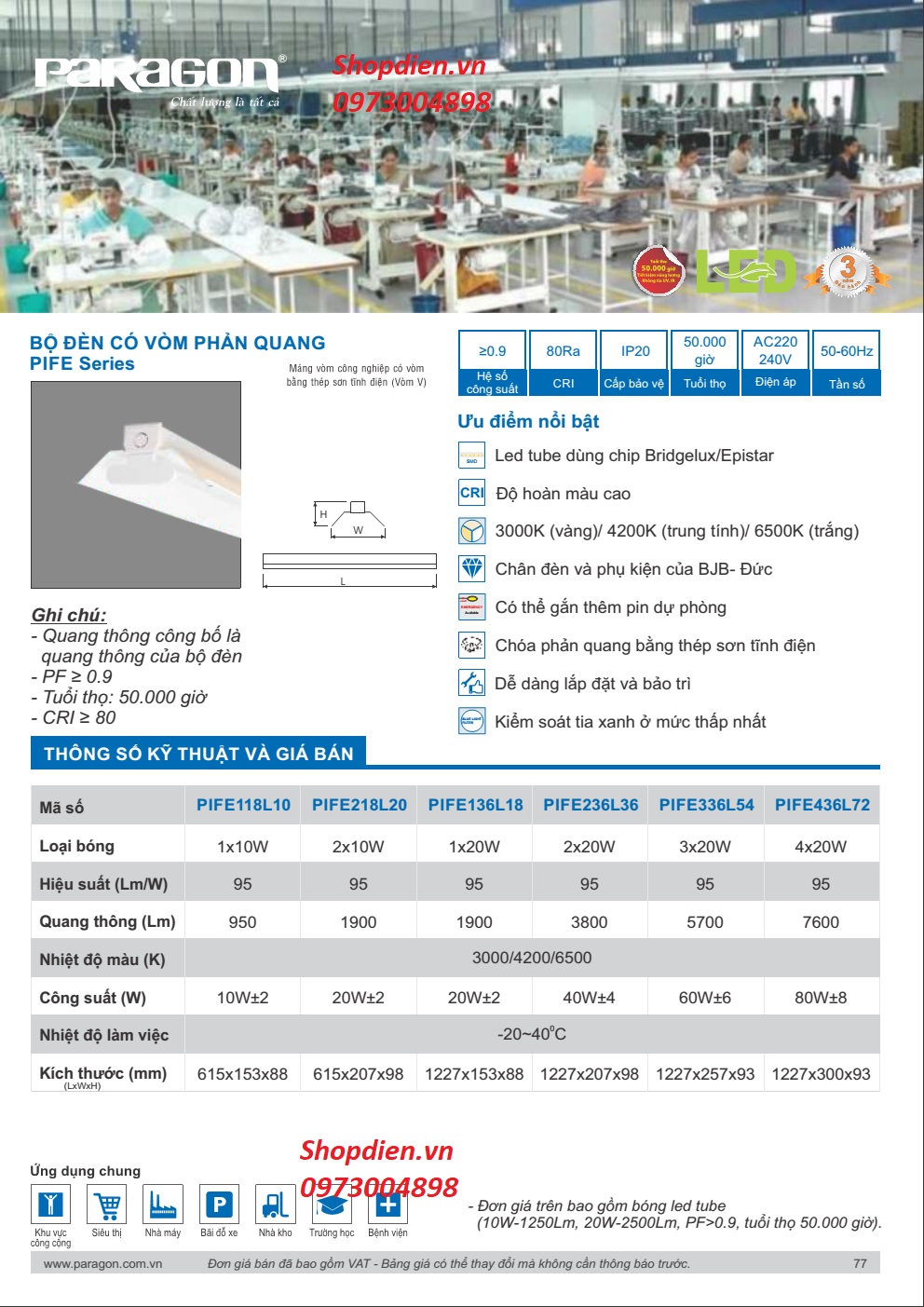 Hệ số công suất: 0.9, tuổi thọ 50.000 giờ.