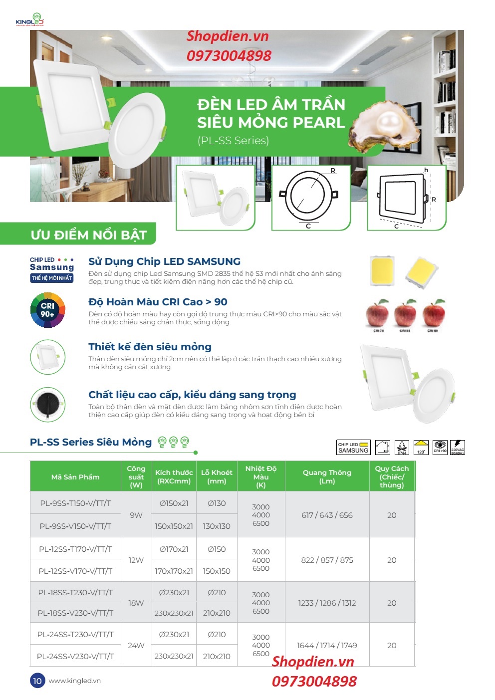 Catalogue : PL-12SS-V170 KINGLED Đèn downlight vuông 12W D150 PEARL âm trần siêu mỏng