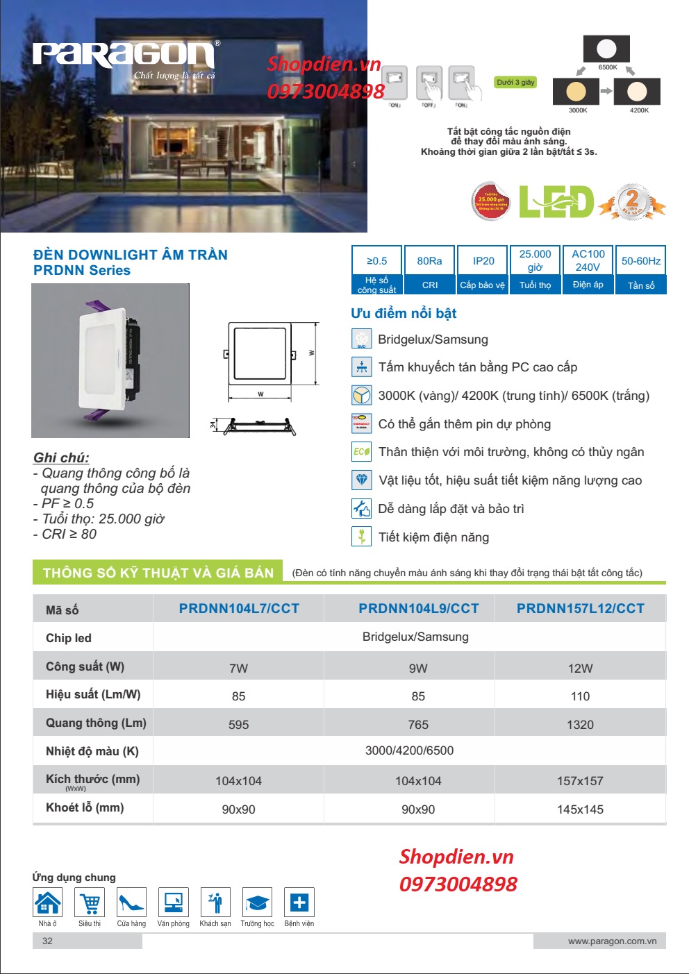 TÊN SẢN PHẨM : PRDNN104L7/CCT Paragon Đèn downlight vuông đổi màu 7W D90 PRDNN âm trần
