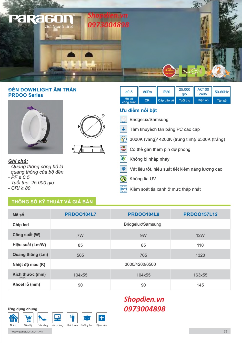 TÊN SẢN PHẨM : PRDOO104L9 Paragon Đèn downlight âm trần 9W D90 PRDOO