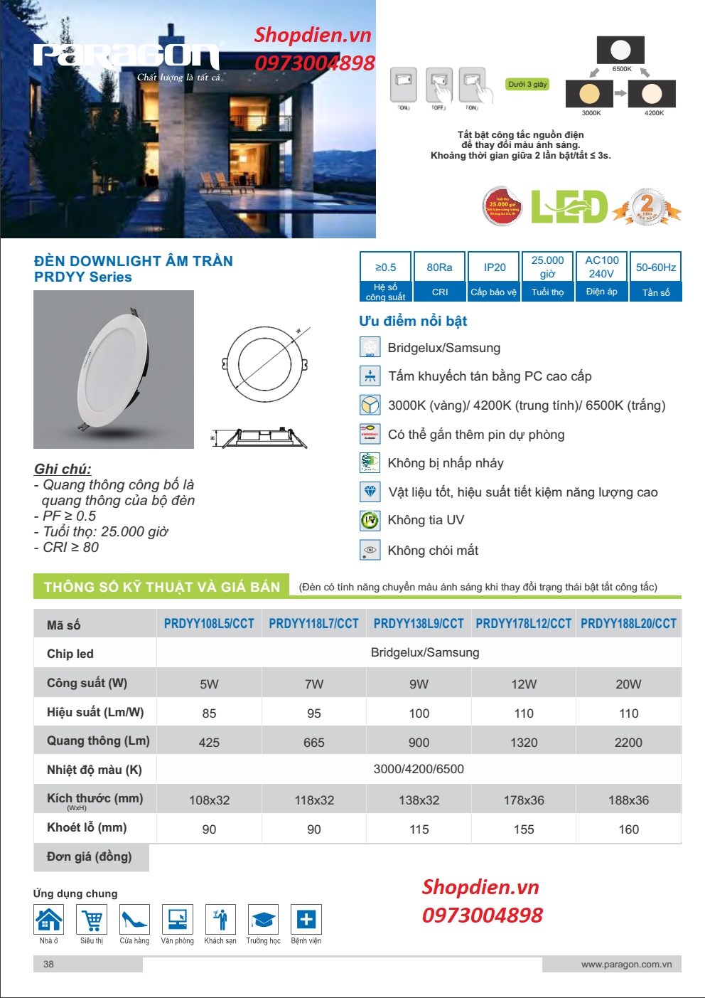 TÊN SẢN PHẨM : PRDYY118L7/CCT Paragon Đèn downlight đổi màu 7W D90 PRDYY âm trần