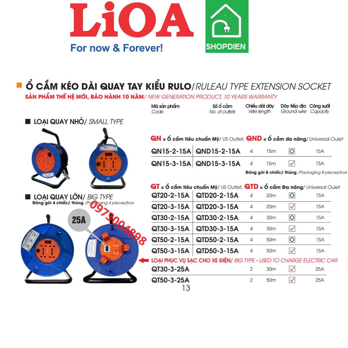 QT50-3-25A LIOA Ổ cắm kéo dài Rulo xách tay 50m cho sạc xe điện của LIOA là giải pháp cung cấp điện an toàn và tiện lợi, đáp ứng nhu cầu sạc cho các dòng xe điện công suất lớn. Sản phẩm được thiết kế dạng rulo quay tay, giúp thu và nhả dây dễ dàng, tránh rối, tiết kiệm diện tích lưu trữ.