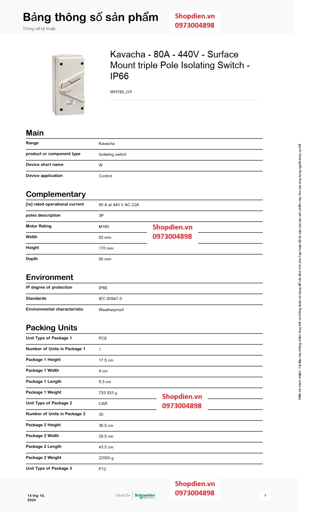 Catalogue ISOLATOR Cầu dao 3P 80A SCHNEIDER WHT80_GY_G19 ngắt điện chống thấm nước