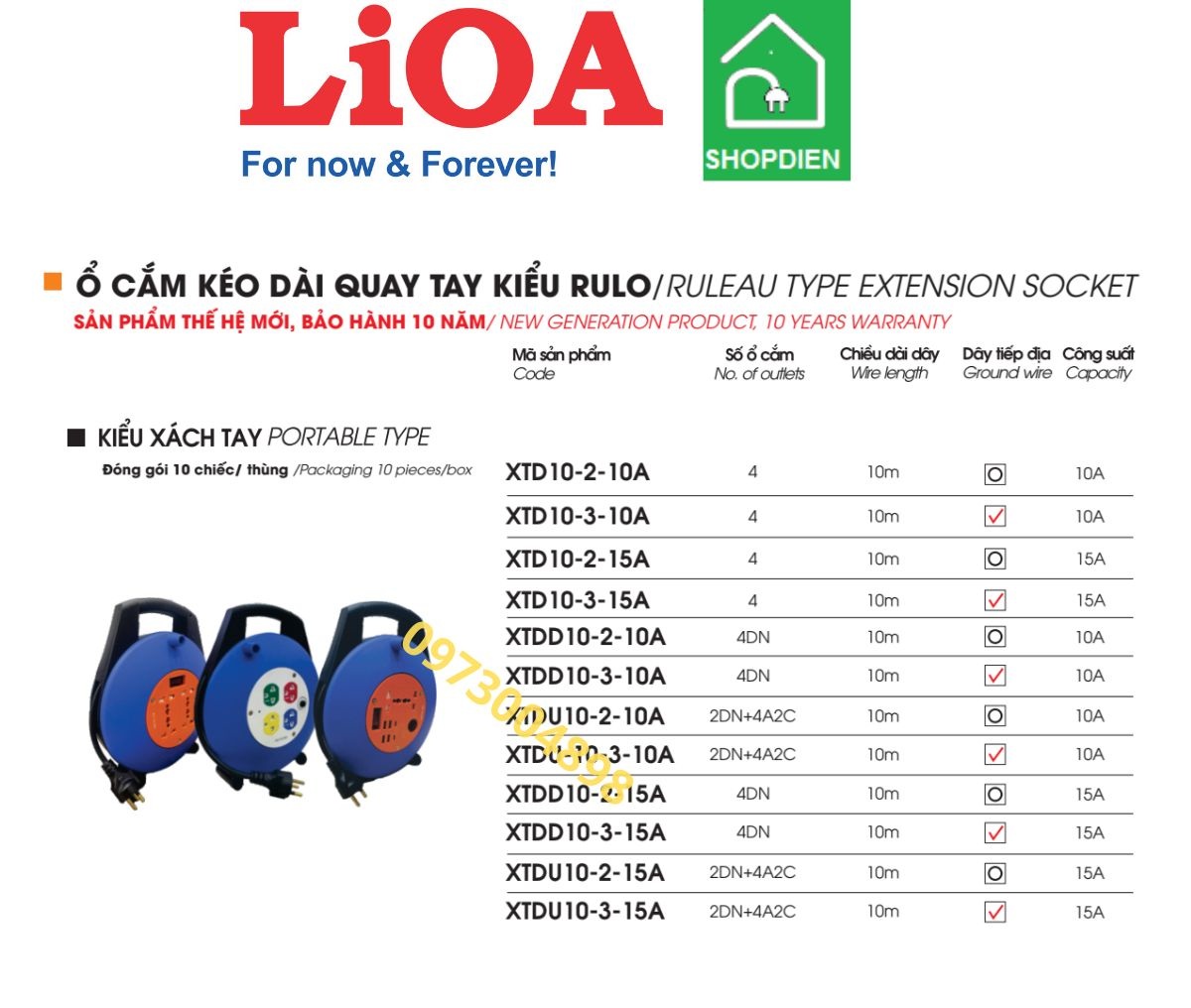 XTDU10-3-15A LIOA Ổ cắm kéo dài Rulo xách tay 4 cổng có USB sạc có tiếp địa của LIOA là giải pháp cấp điện linh hoạt, an toàn và tiện lợi cho nhiều nhu cầu sử dụng trong gia đình, văn phòng hay công trình. Sản phẩm được thiết kế dạng cuộn rulo quay tay, giúp thu gọn và bảo quản dây dễ dàng, hạn chế rối hoặc hư hỏng dây điện.